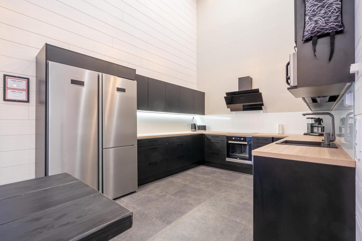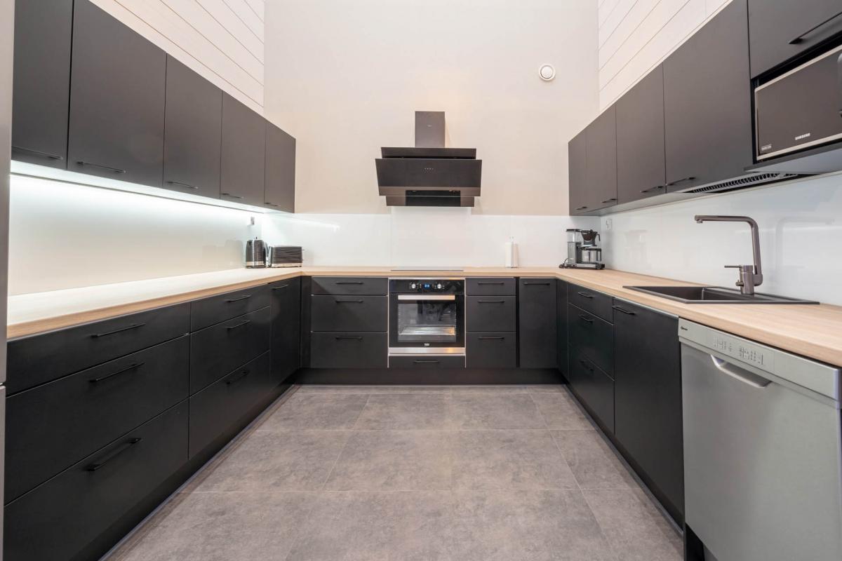 2x jääkaappi-pakastin, uuni, induktioliesi, mikroaaltouuni, astianpesukone, kahvinkeitin, vedenkeitin, leivänpaahdin, astiasto ja ruoanlaittovälineet.