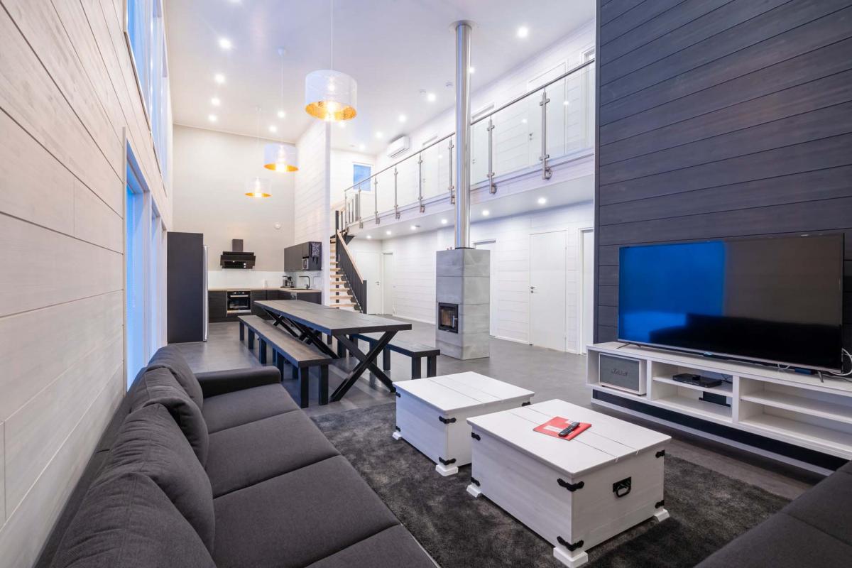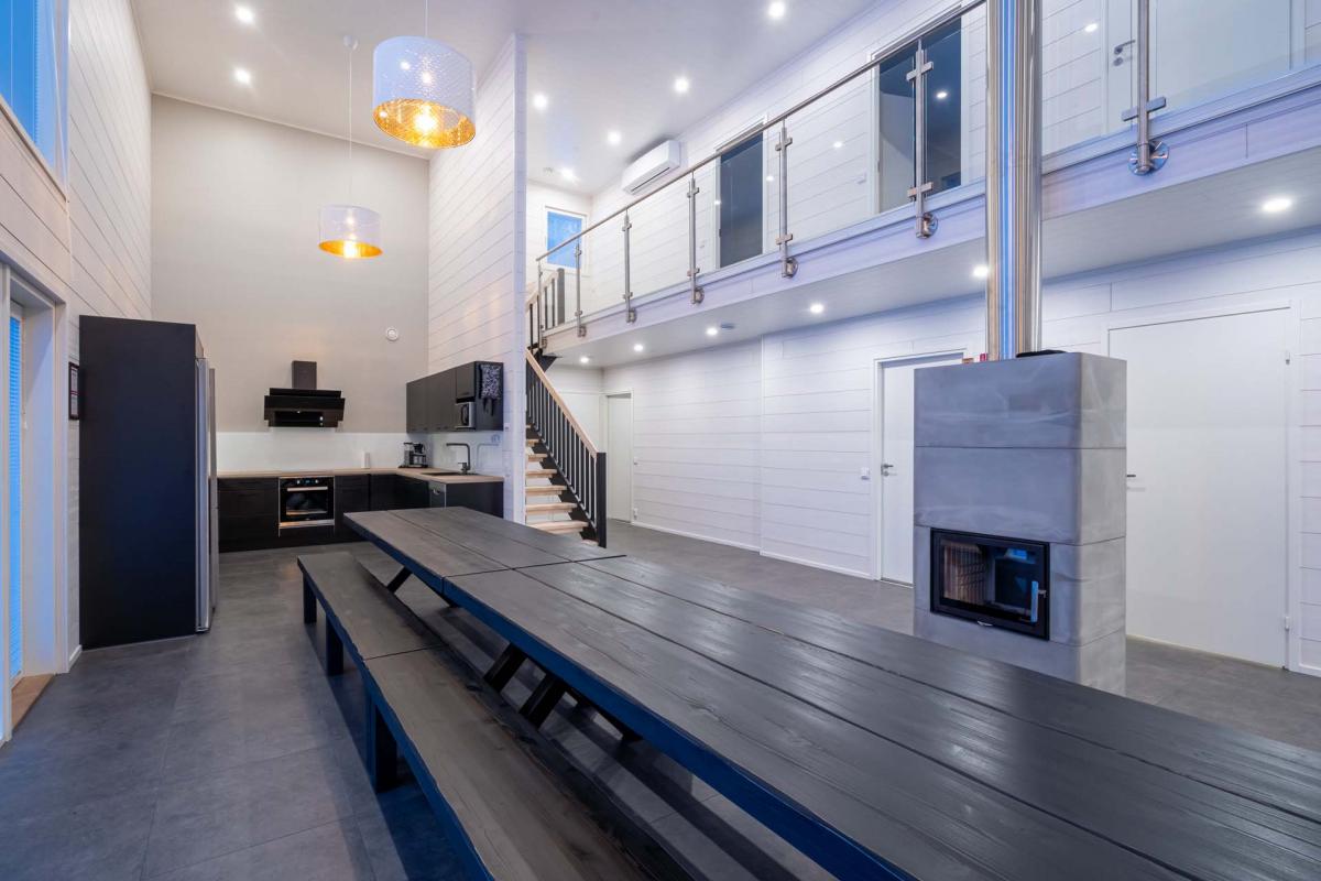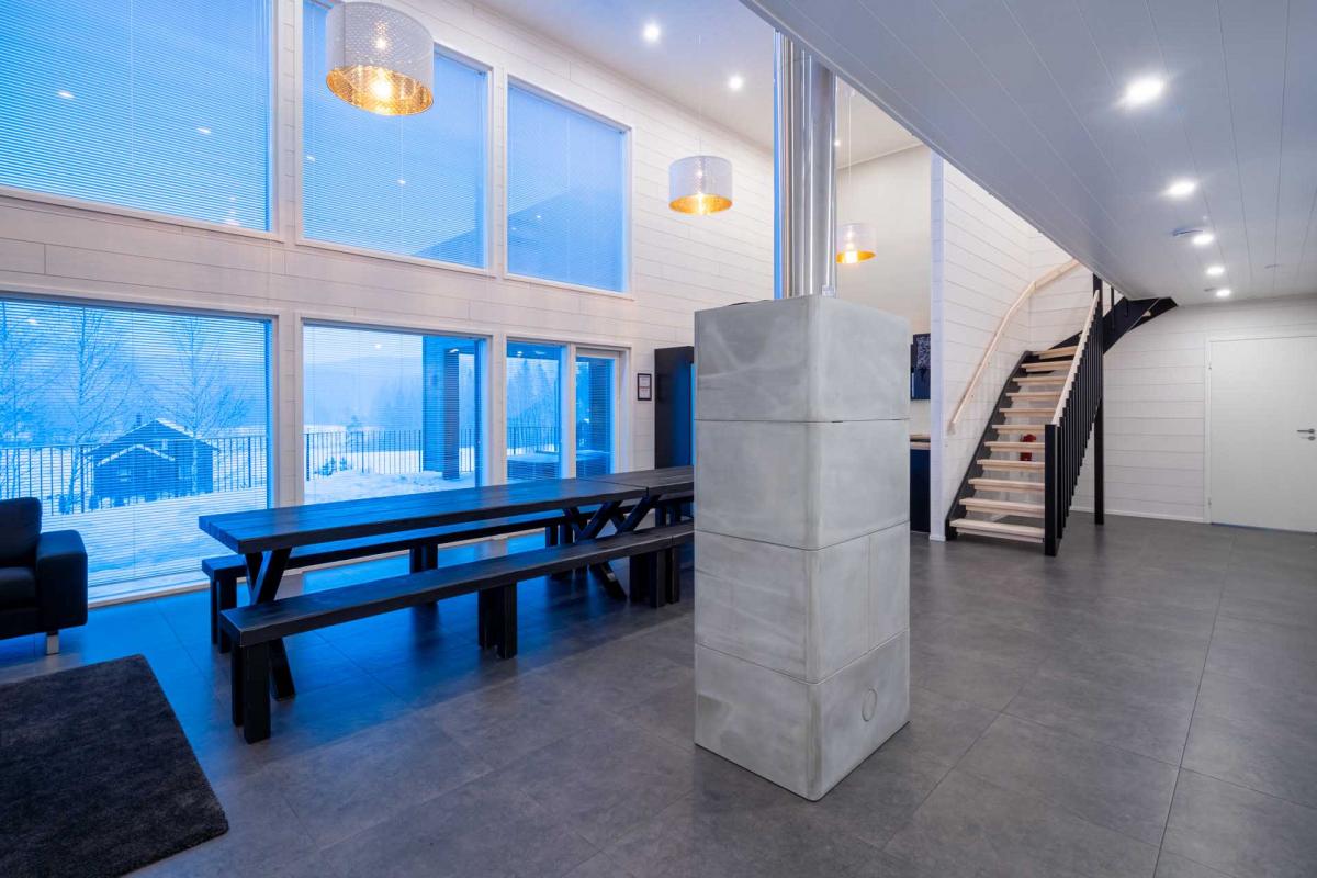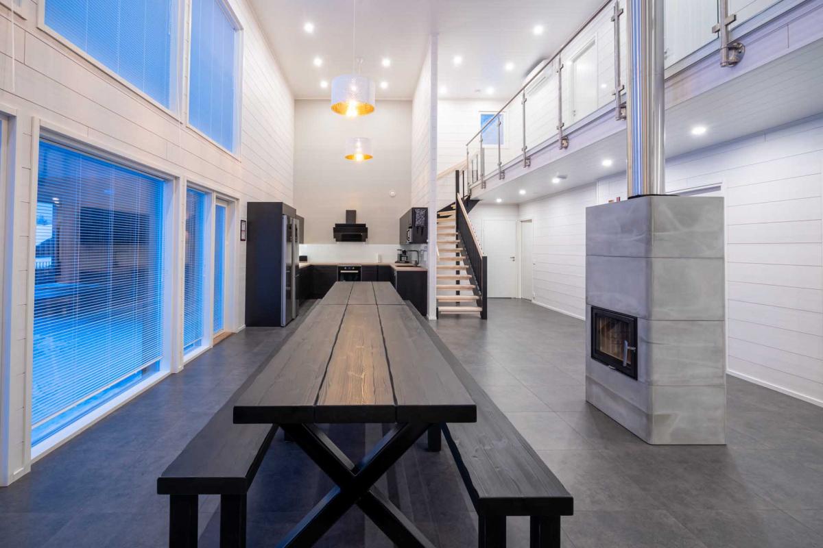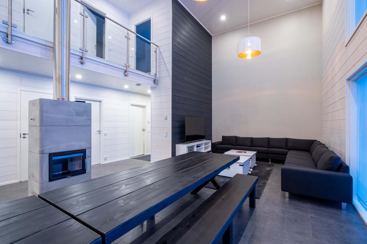 Avarassa olohuone-keittiötilassa on upeat maisemat golfkentälle ja Himoksen rinteille, ja siellä on mittatilaustyönä valmistettu ruokapöytä 21 hengelle. Myös kokoustaminen onnistuu mainiosti tämän 5 metrin pituisen pöydän ympärillä. Myyntipalvelustamme on vuokrattavissa videotykki, jonka kuva voidaan heijastaa olohuoneen seinälle. Olohuoneessa myös viihtyisä oleskelutila, tv ja takka, joka luo tunnelmaa.